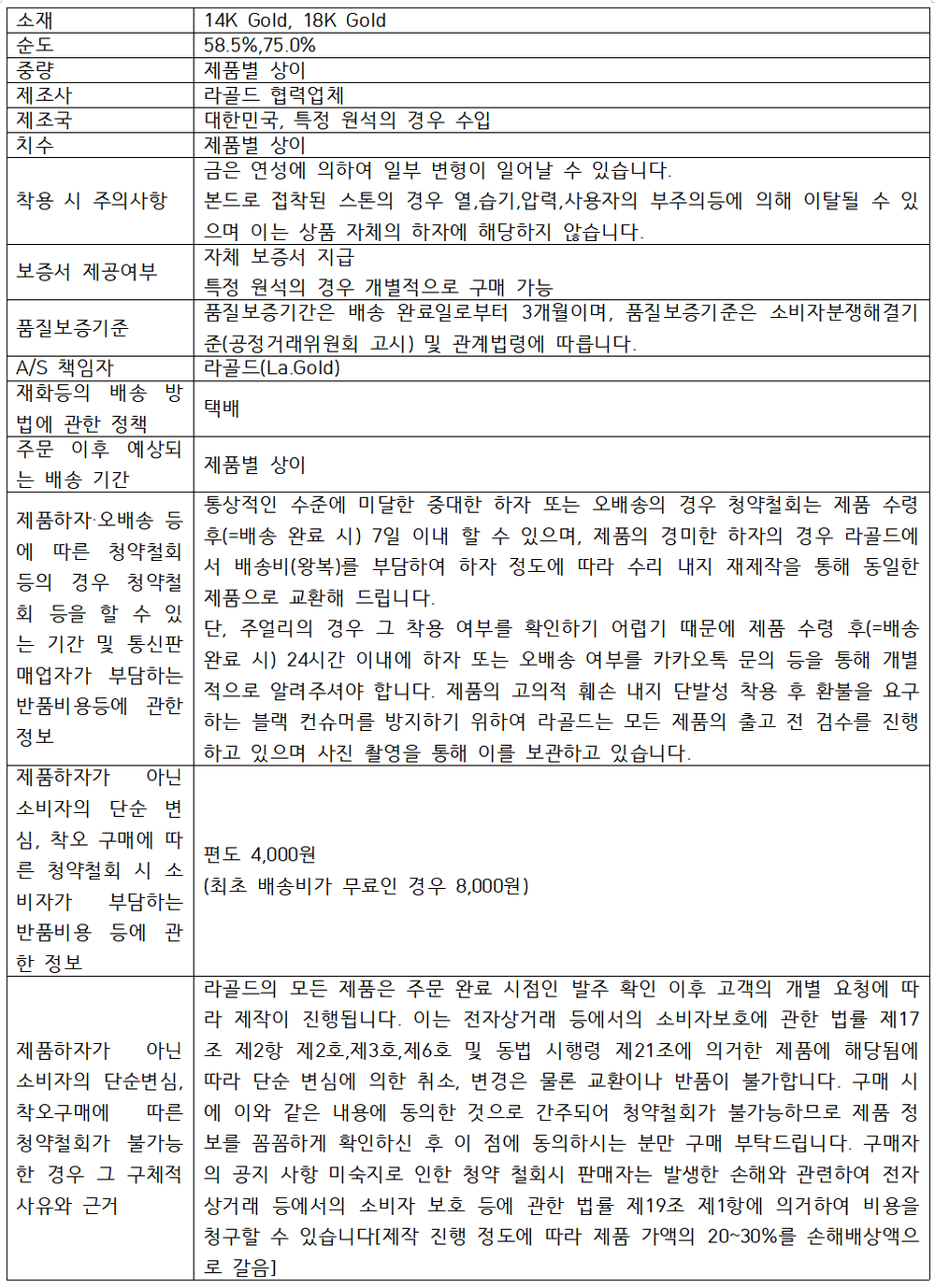 라골드(La.Gold)의 모든 제품은 고객의 개별 요청에 맞추어 주문과 동시에 1:1로 제작이 진행되는 오더 메이드 제품으로 주문 완료 시점인 발주 확인 이후 제작 단계부터는 품위/컬러/사이즈·길이 선택 miss 등 단순 변심에 의한 취소, 변경, 교환, 환불이 불가하며 [전자상거래 등에서의 소비자보호에 관한 법률]에 의거하여 청약철회 제한 제품에 해당함을 명시합니다.